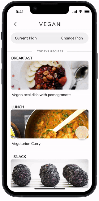 The meal plans feature offered nutritionally balanced daily recipes designed to support users’ most common dietary needs. All content was created in collaboration with a certified nutritionist and organized into six distinct meal plans.