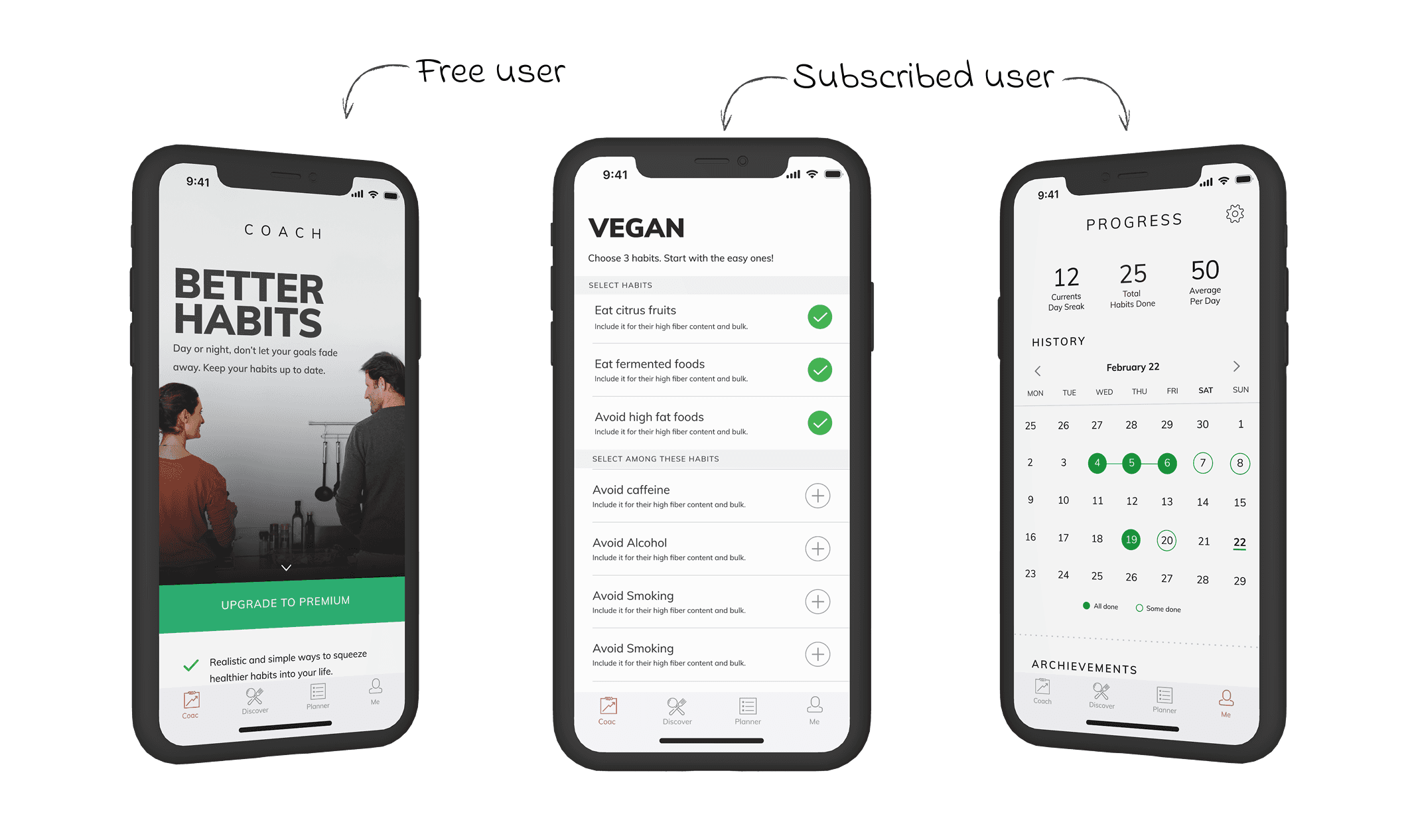 The habit tracker (named coach on the app) is a premium feature that’s complementary to the users chosen plan. It aims to help building a sustainable meal routine. On this tab the user would see a list of suggested habits related to the plan that the user can choose from.