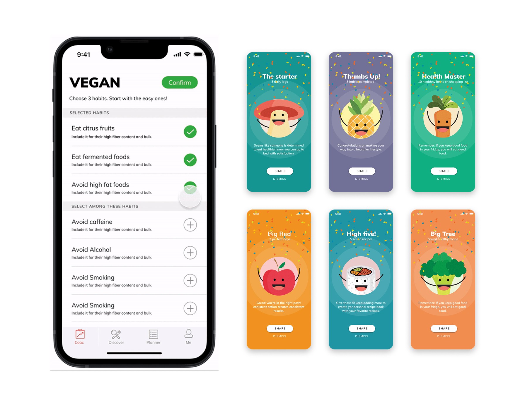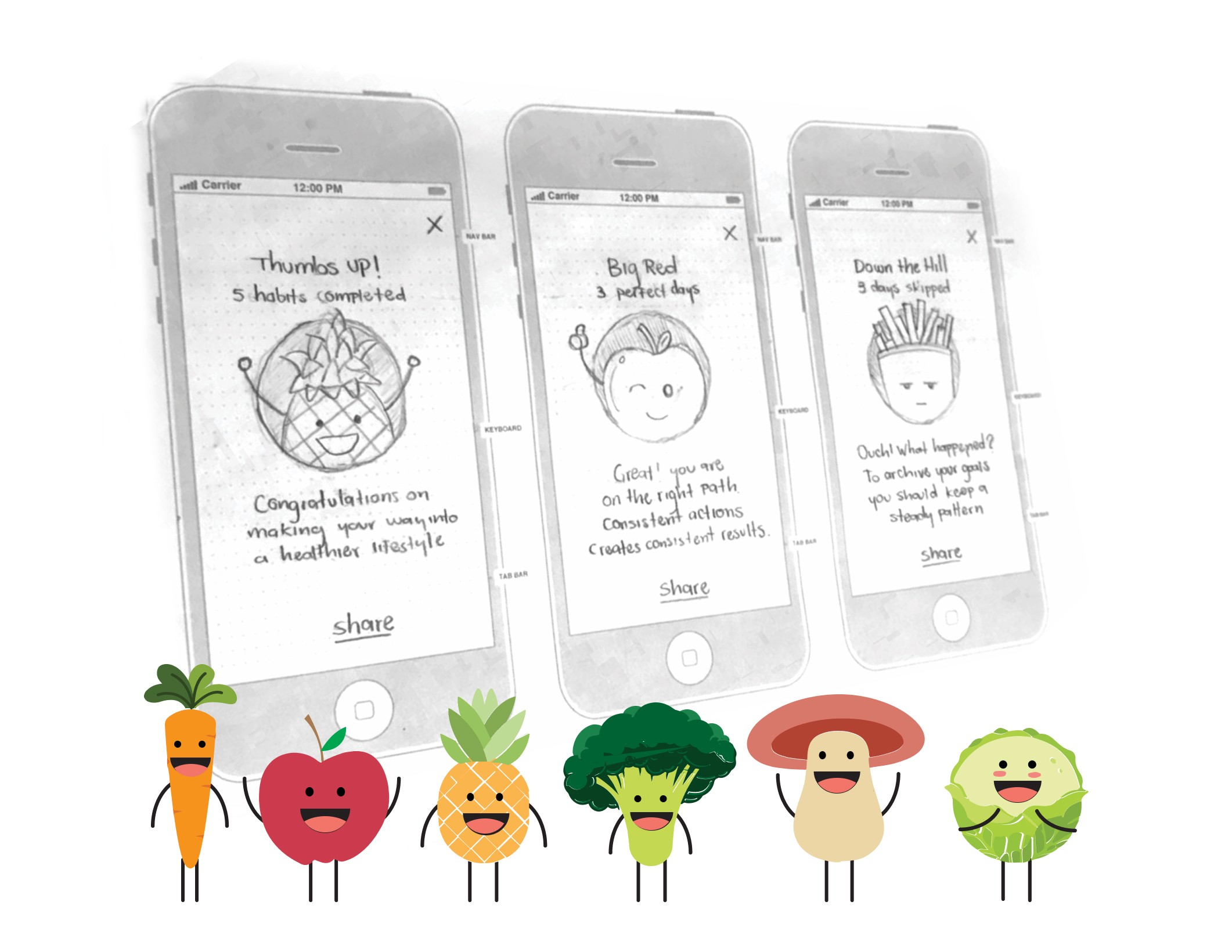In order to engage the user and make tasks fun and enjoyable, I created a series of playful character ba– dges based on food items. To obtain the badges the user would have to complete a series of goals listed on the habit tracker, as for example, have 3 glasses of water a day or eat vegetarian meals for a straight week.